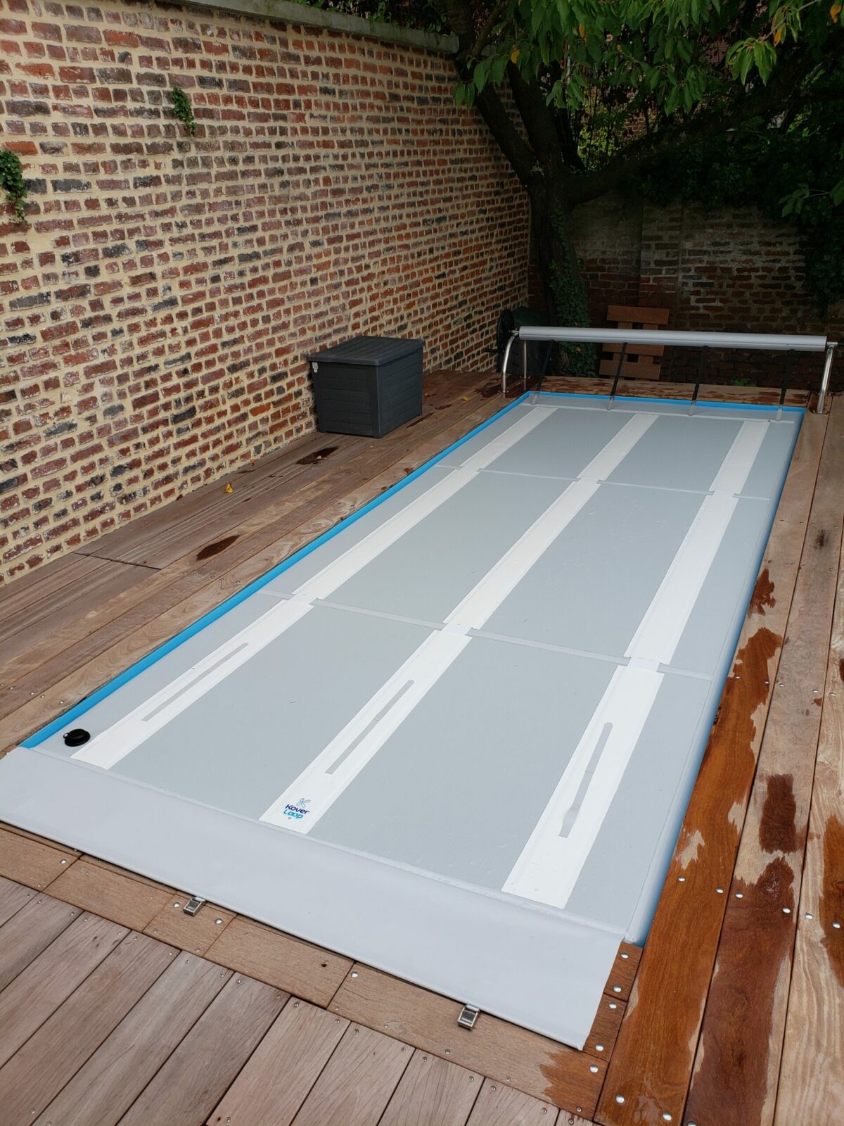 KOVERLOOP s’intègre parfaitement grâce à la toile de débord qui se repose au dessus de la margelle. Il est possible de la personnaliser en couleur ou graphisme.